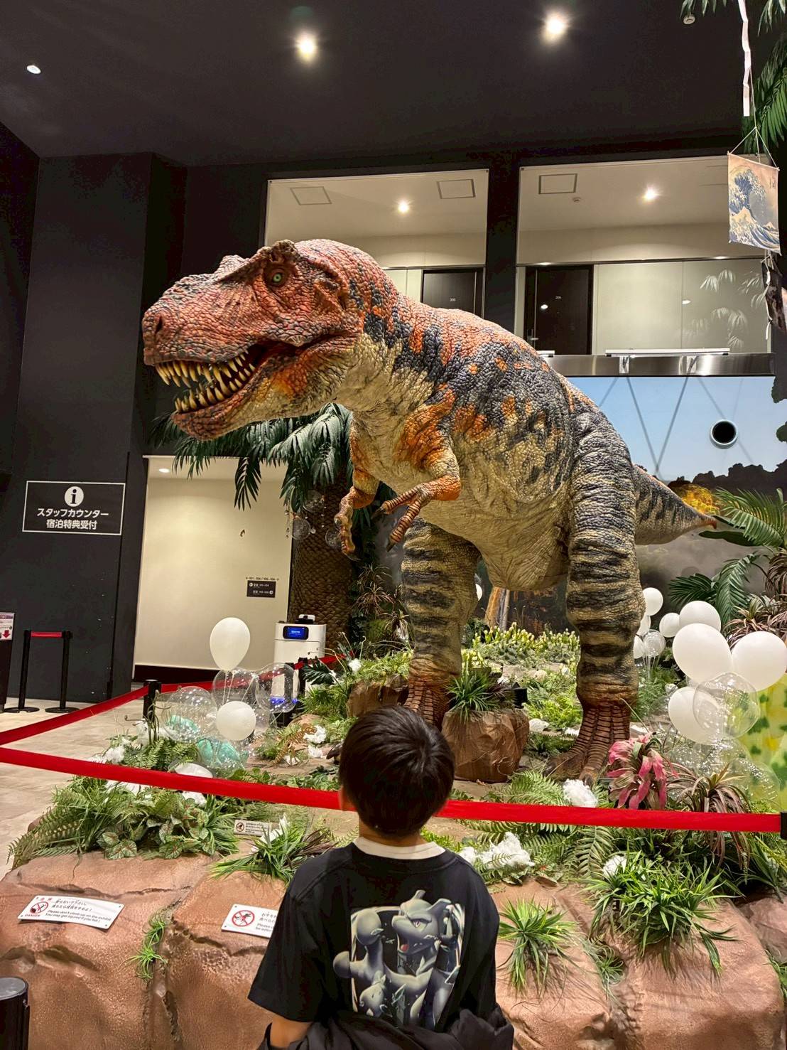 宿泊は併設の「変なホテル」。ロビーでは恐竜がお出迎えしてくれて、チェックイン前から子供たちのテンションは最高潮。「動くの?話すの?」と興味津々でした。