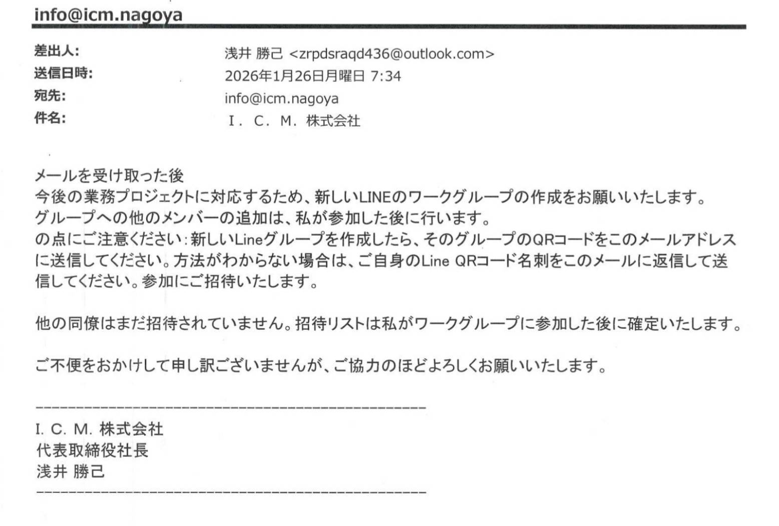 最近、弊社にも怪しいメールが届きました。 社長や上司の名前で「LINEグループに入って」と誘う手口が流行っています。
