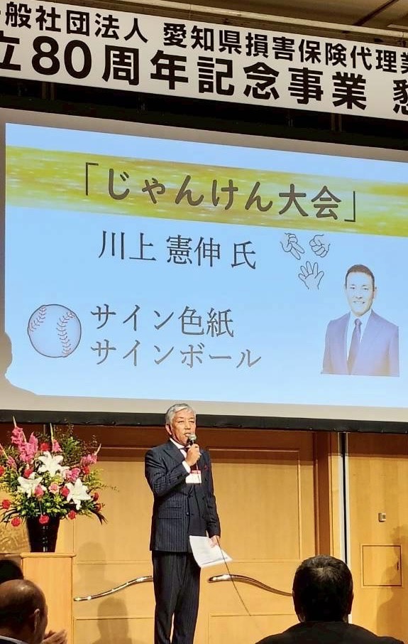 懇親会では、ドラゴンズファンでもある浅井が、その想いを熱く語るマイクパフォーマンスを披露し、閉会の辞とは一味違った一面を見せて